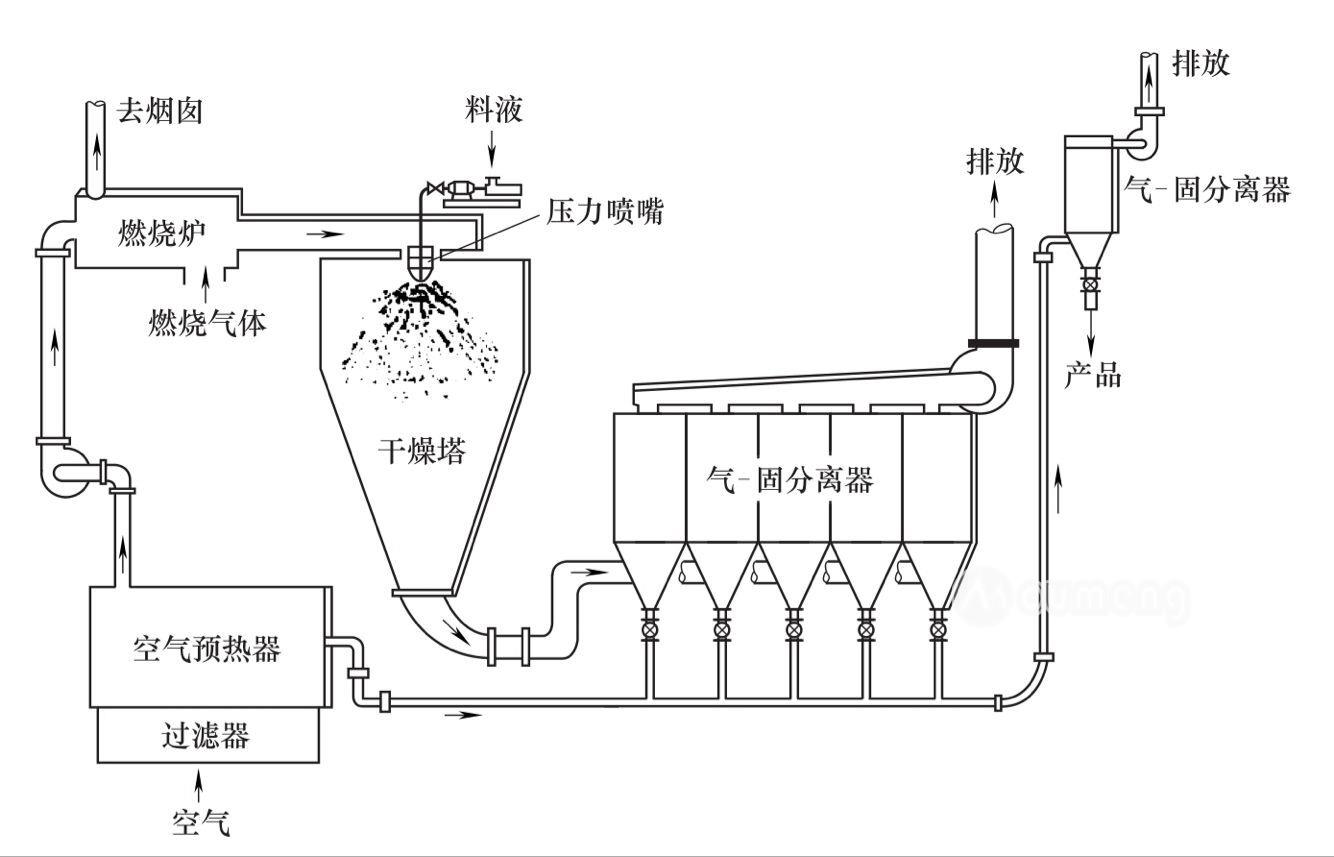 本流程的特征是塔中的廢氣,經(jīng)過旋風分離器的一級氣-固分離后,廢氣再進入濕式洗滌器,進行第2次氣-固分離,然后,再排放到大氣中,如圖所示。待洗滌液達到一定濃度之后,泵送到料槽,噴霧干燥,回收產(chǎn)品。