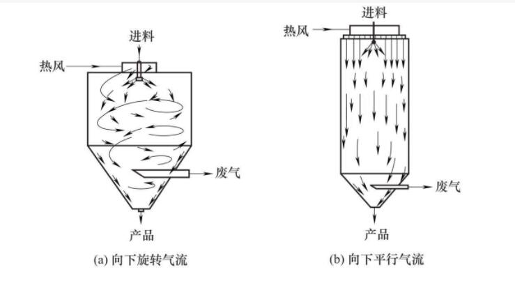 空氣經過濾和加熱,進入噴霧干燥機頂部空氣分配器,熱空氣呈螺旋狀平均地進入干燥室。料液經塔體頂部的高速離心霧化器,(旋轉)噴霧成極細微的霧狀液珠,與熱空氣并流接觸在極短的時間內可干燥為廢品。廢品連續地由干燥塔底部和旋風別離器中輸出,廢氣由引風機排空。
