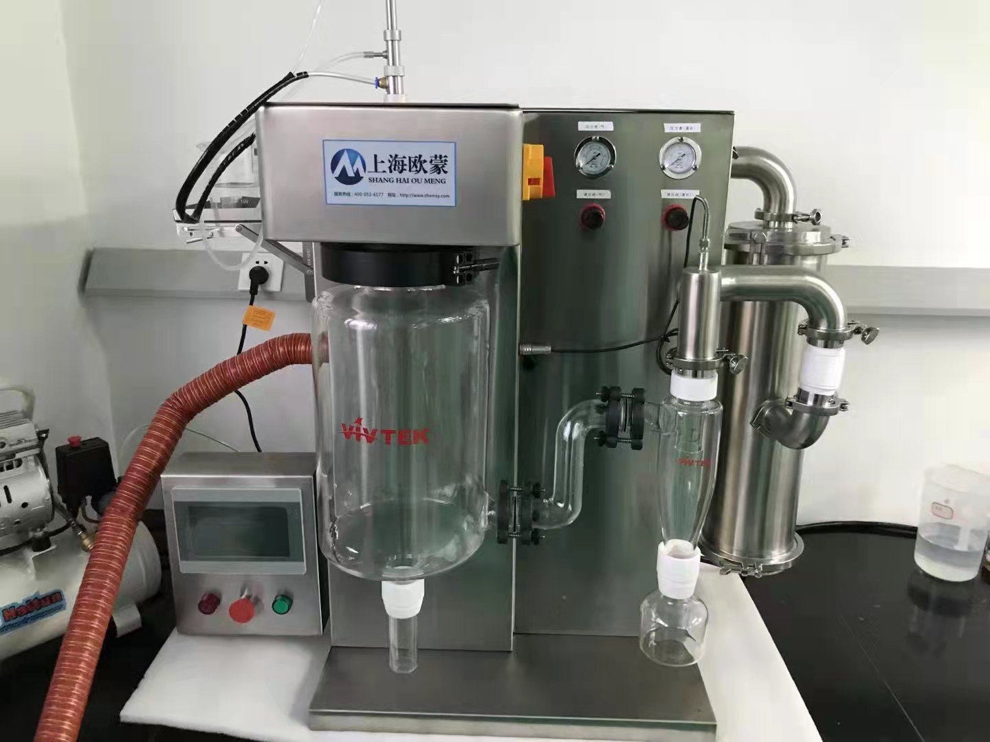 (16)可搭配OM-YJ-500型氮氣循環(huán)有機溶劑回收裝置,可將干燥機放置在本裝置上進行連接即可成為有機溶劑噴霧干燥機(密閉氮氣循環(huán),溶劑可回收)。